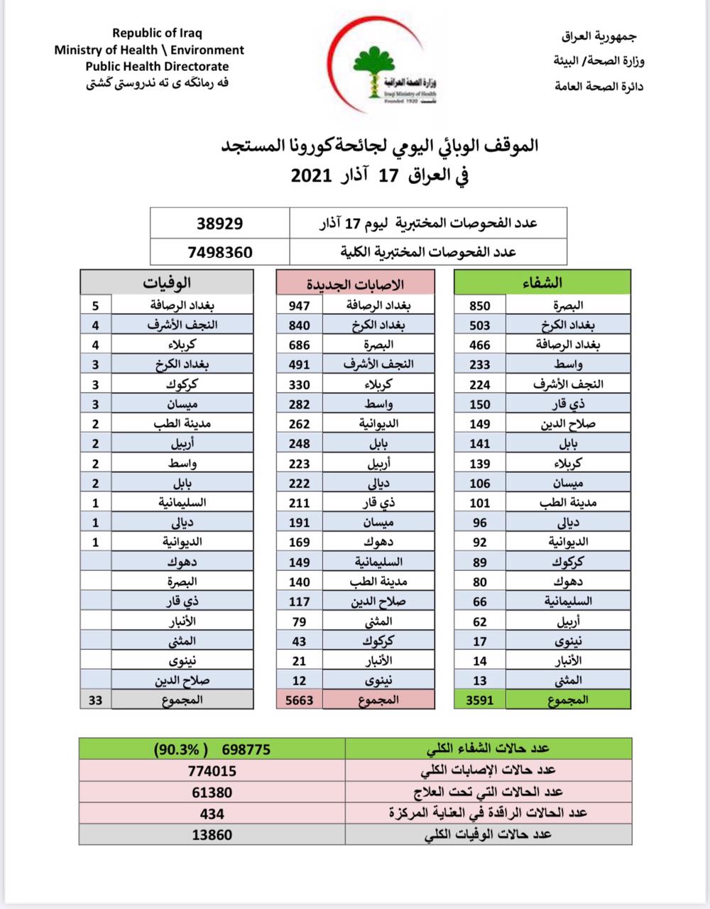أعلنت وزارة الصحة، اليوم الأربعاء، الموقف الوبائي الخاص بجائحة كورونا في العراق.