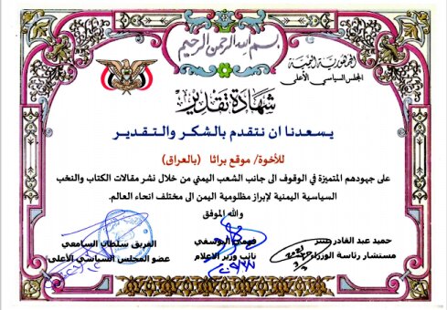تلقت هيئة تحرير وكالة انباء براثا رسالة شكر وعرفان من رئاسة الجمهورية اليمنية مرفقة بشهادة تقديرية تقديرا وتثمينا لدور الموقع في دعم القضية اليمنية..والوكالة إذ تتقدم بوافر الشكر والتقدير الى القيادة اليمنية على هذه الإلتفاتة الكريمة تعاهد الشعب اليمني وقيادته المجاهدة وسائر الشعوب المستضعفة على البقاء على نفس المنهج الذي لن تحيد عنه إلا أن يقضي الله أمر كان مفعولا..