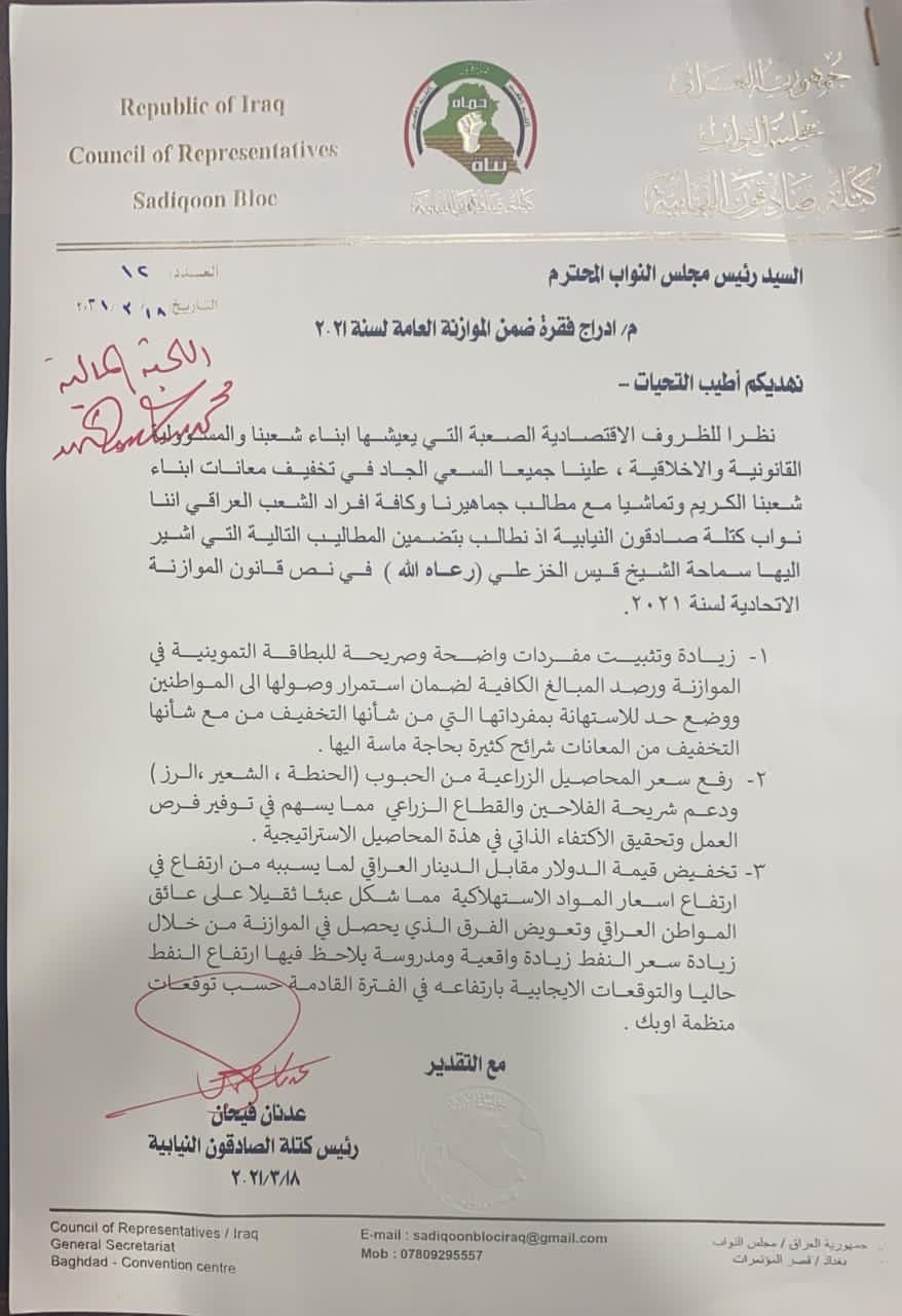 صادقون النيابية تقدم طلبا لرئيس البرلمان يتضمن مقترحات “الخزعلي” لاضافتها في الموازنة
