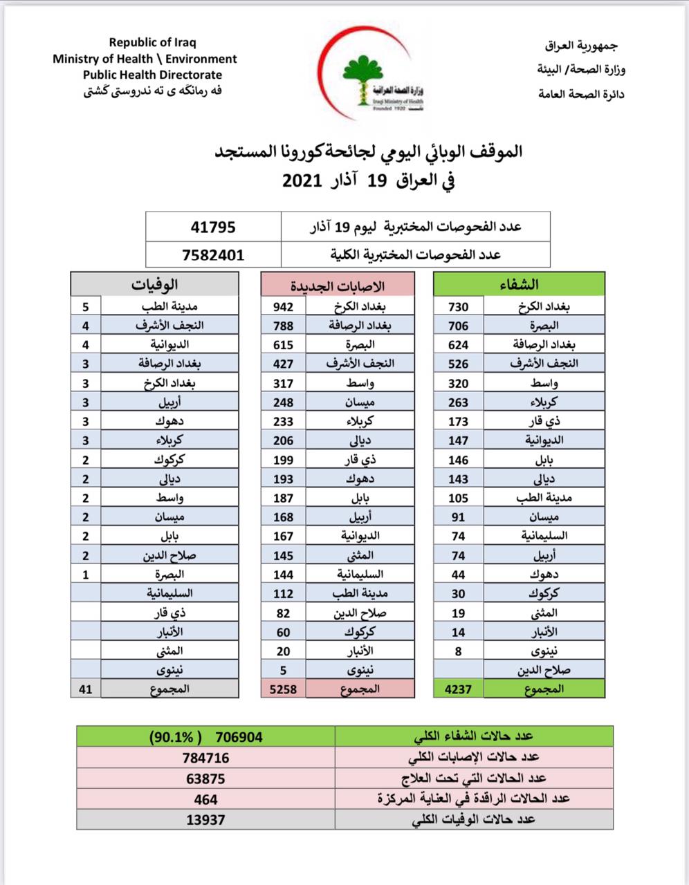 أعلنت وزارة الصحة، اليوم الجمعة، الموقف الوبائي الخاص بجائحة كورونا في عموم العراق.
