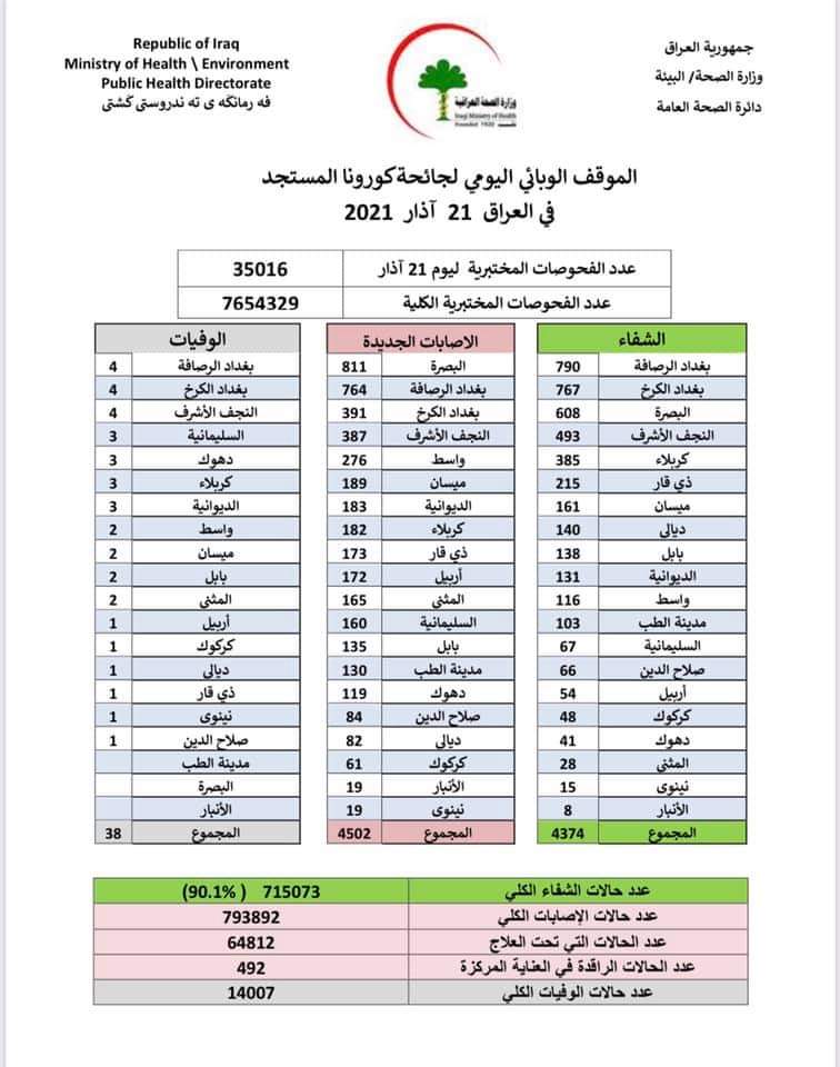 أعلنت وزارة الصحة، اليوم الأحد، الموقف الوبائي الخاص بجائحة كورونا في العراق.