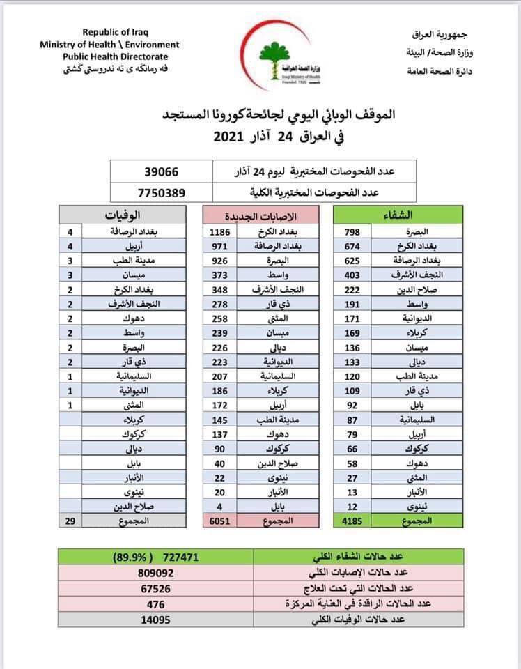 وقالت الوزارة في بيان ، إن "العراق سجل اليوم، 6051 إصابة جديدة بالفيروس، و 4185 حالة شفاء، مقابل 29 وفاة بالفيروس".