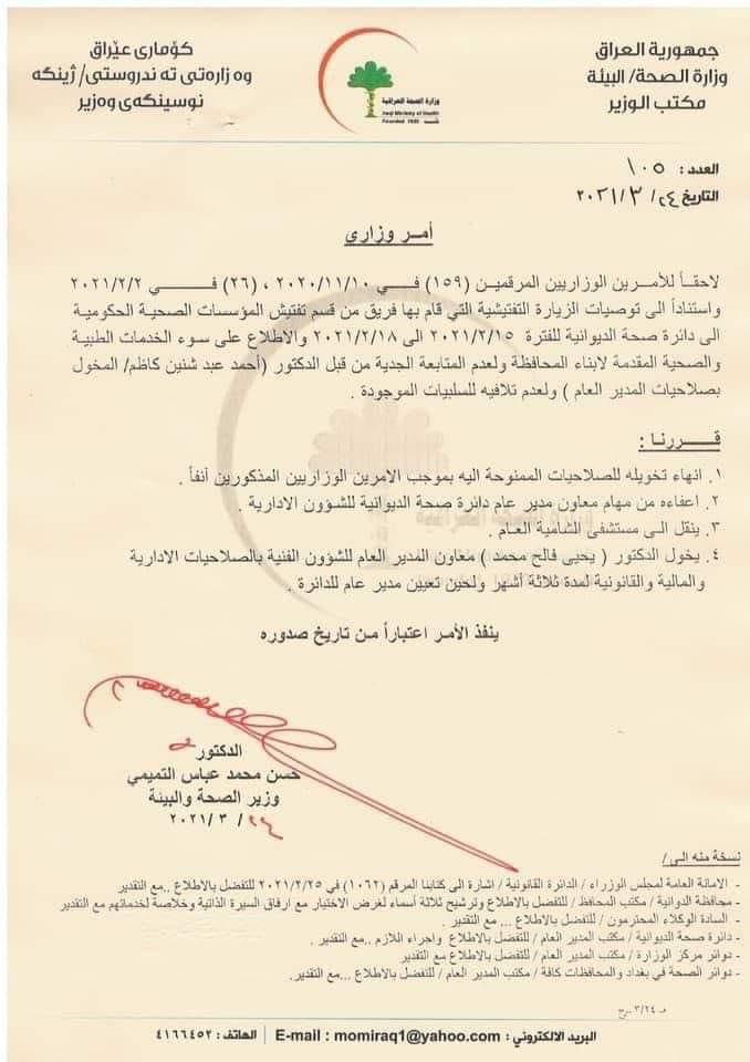 قرر وزير الصحة حسن التميمي، اليوم الأربعاء، إعفاء مدير عام دائرة صحة الديوانية أحمد عبد شنين كاظم، من منصبه، وتكليف يحيى فالح محمد بدلاً عنه.