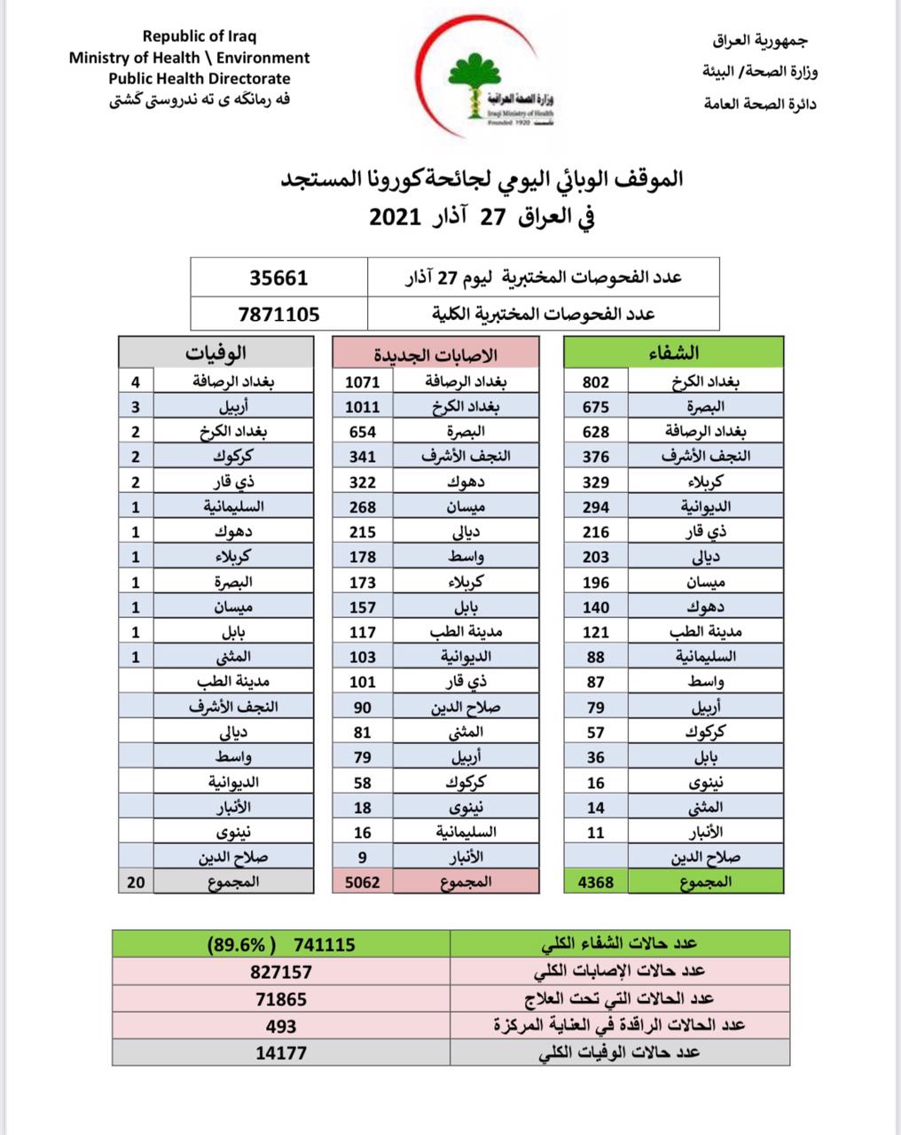 أعلنت وزارة الصحة، اليوم السبت، الموقف الوبائي الخاص بجائحة كورونا في عموم العراق.