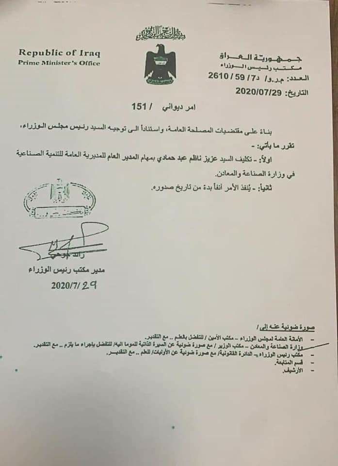 وقال مصدر قام بتسريب الوثيقة انه بعد التوسط عند رئيس الوزراء مصطفى عبد اللطيف مشتت تم تعيين عزيز ناظم في المنصب والطريف انه تم تعيينه بالاصالة وليس بالوكالة حيث كان موظف بسيط لا يحمل شهادة تؤهله لهذا المنصب فتحول بين ليلة وضحاها الى مدير عام يتربع على المليارات من خلال مشاريع التنمية الصناعية في الوزارة
