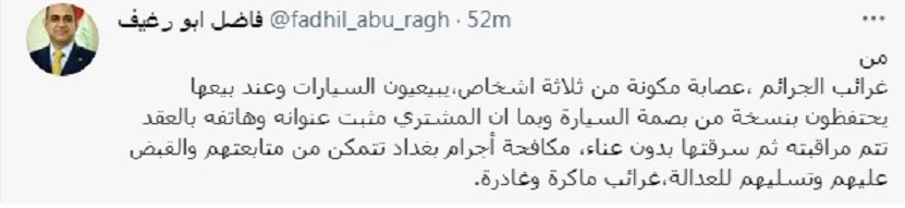 وقال ابو رغيف في تغريدة له على تويتر من غرائب الجرائم عصابة مكونة من ثلاثة اشخاص يبيعيون السيارات وعند بيعها يحتفظون بنسخة من "بصمة السيارة" وبما ان المشتري مثبت عنوانه وهاتفه بالعقد تتم مراقبته ثم سرقتها بدون عناء.