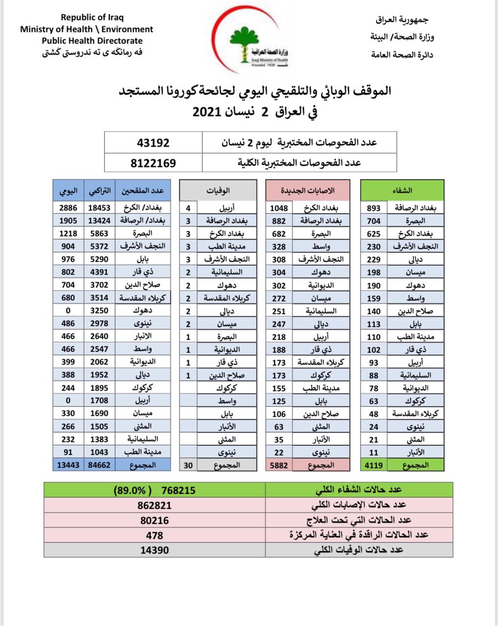 أعلنت وزارة الصحة، اليوم الجمعة، الموقف الوبائي الخاص بجائحة كورونا في عموم العراق.