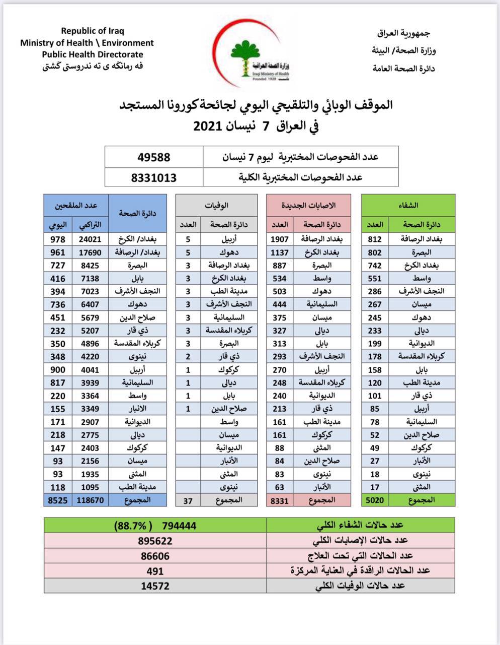 الوزارة قالت في بيان، ان "مختبراتها سجلت 8331 إصابة جديدة، و37 حالة وفاة و5020 حالة شفاء".