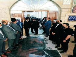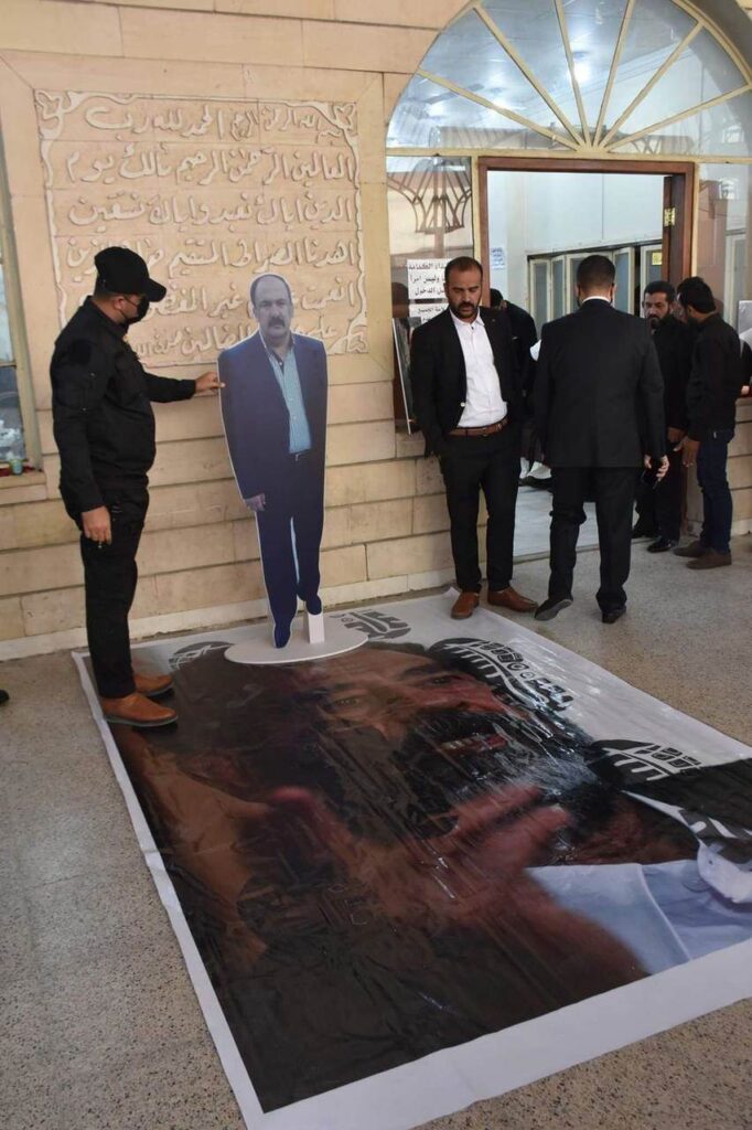 وبحسب صورة التقطت داخل مجلس عزاء القاضي العراقي محمد العريبي، فإن صورة الطاغية المقبور وضعت على الأرض في مدخل قاعة المجلس، وداس عليها المعزون.