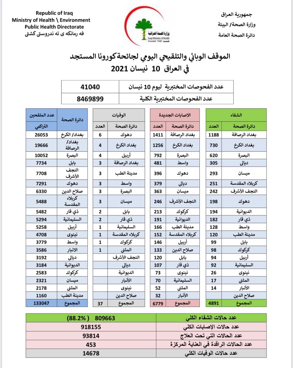 أعلنت وزارة الصحة، اليوم السبت، الموقف الوبائي الخاص بجائحة كورونا في عموم العراق.