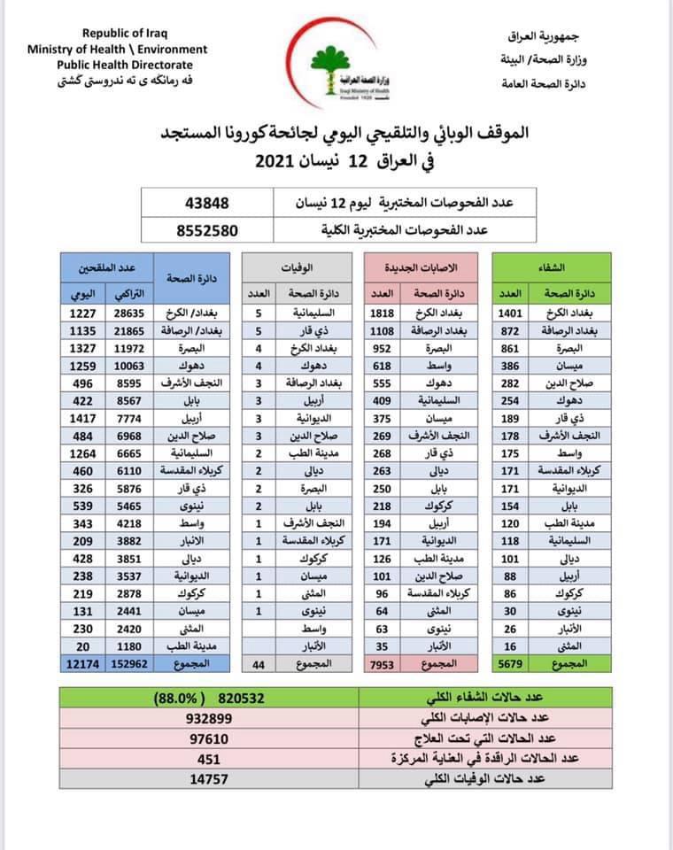أعلنت وزارة الصحة والبيئة، اليوم الاثنين، الموقف الوبائي الخاص بجائحة كورونا في عموم العراق.