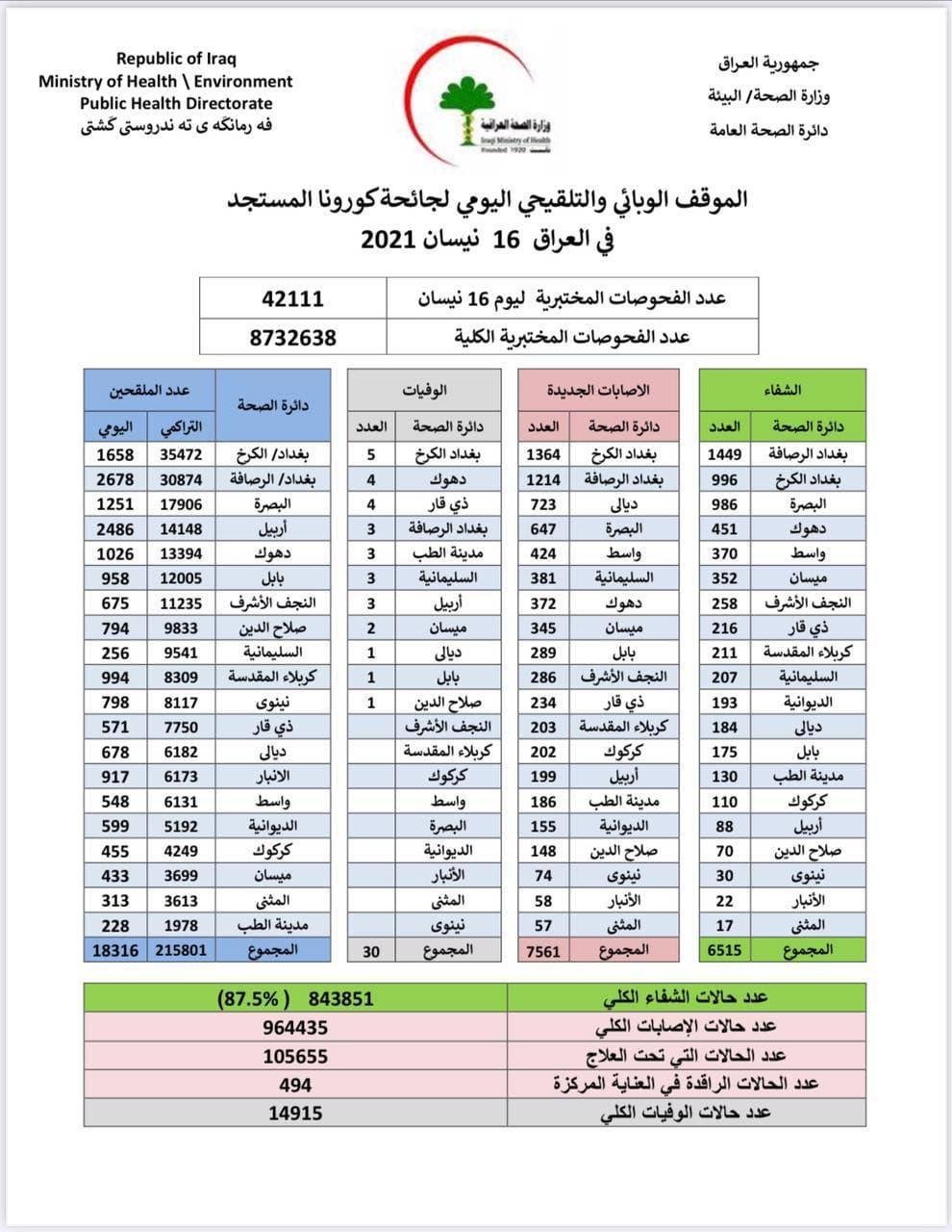 أعلنت وزارة الصحة، اليوم الجمعة، الموقف الوبائي الخاص بجائحة كورونا في عموم العراق.