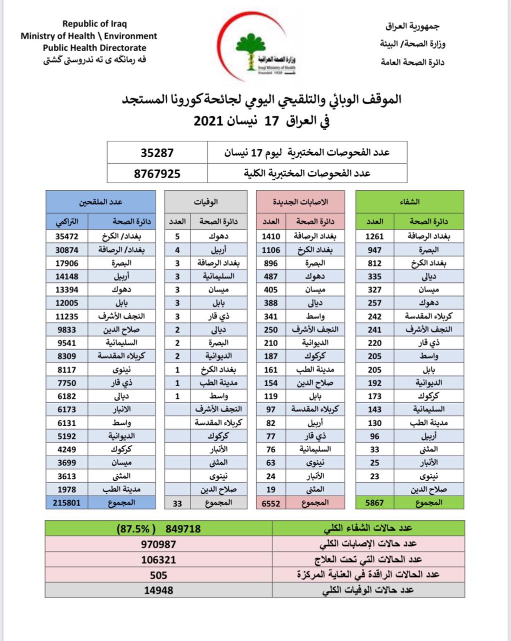 أعلنت وزارة الصحة، اليوم السبت، الموقف الوبائي الخاص بجائحة كورونا في عموم العراق.