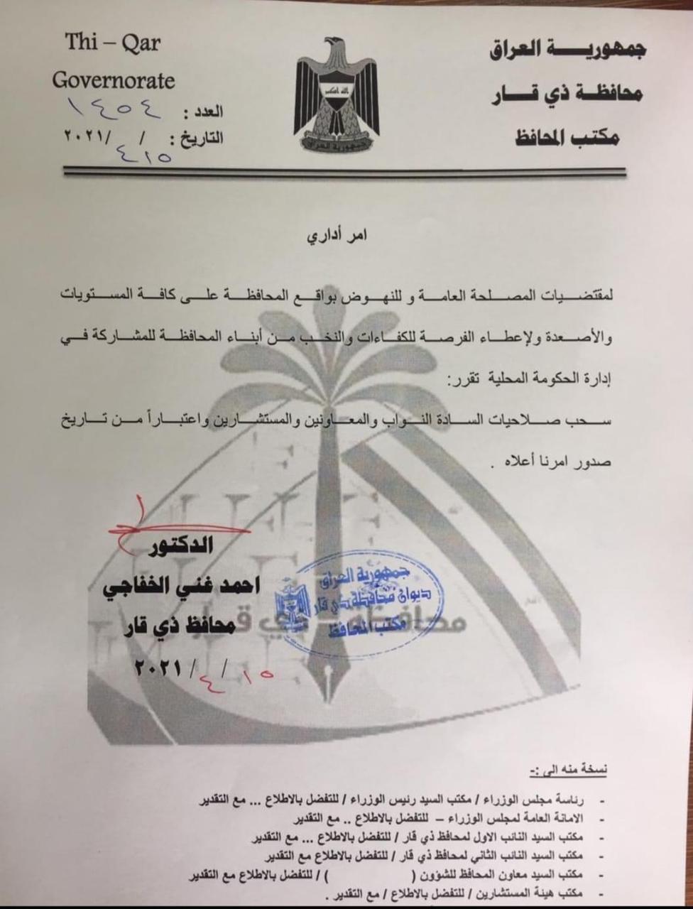 أصدر محافظة ذي قار الجديد، أحمد الخفاجي، قراراً بسحب الصلاحيات من نائبيه ومعاونيه، ومستشاريه.