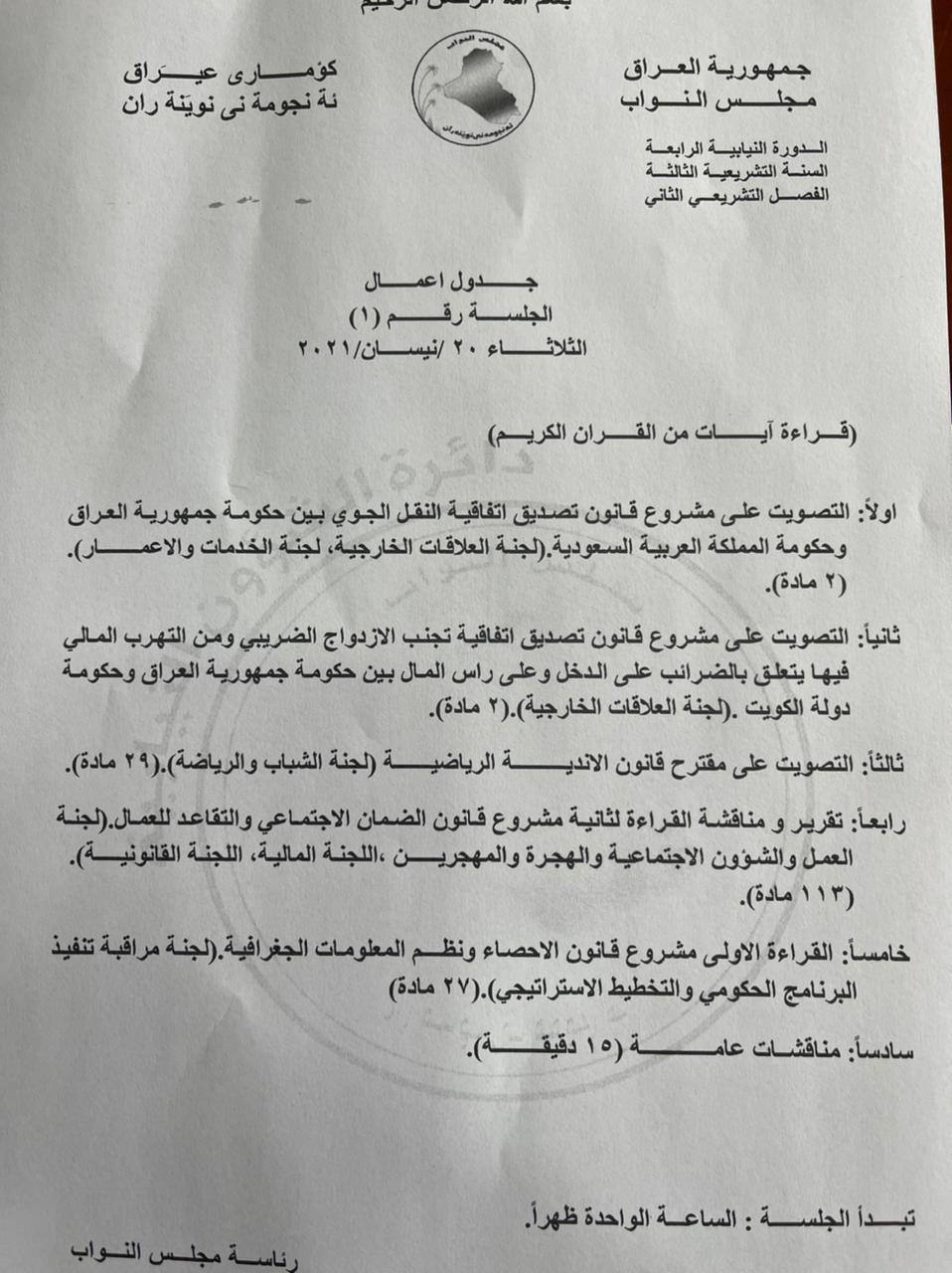الدائرة قالت في بيان ان "جدول الاعمال تضمن التصويت على مشروع قانون تصدیق اتفاقية النقل الجوي بين حكومة العراق والحكومة السعودية، والتصويت على مشروع قانون تصدیق اتفاقية تجنب الازدواج الضريبي و التهرب المالي فيها يتعلق بالضرائب على الدخل وعلى راس المال بين حكومة العراق وحكومة الكويت".