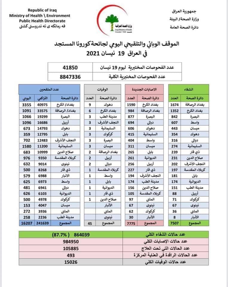 وقالت الوزارة في بيان ، إنها "سجلت 7775 حالة إصابة جديدة في عموم العراق، مقابل تماثل 7507 حالة للشفاء، و 45 وفاة جراء الفيروس".