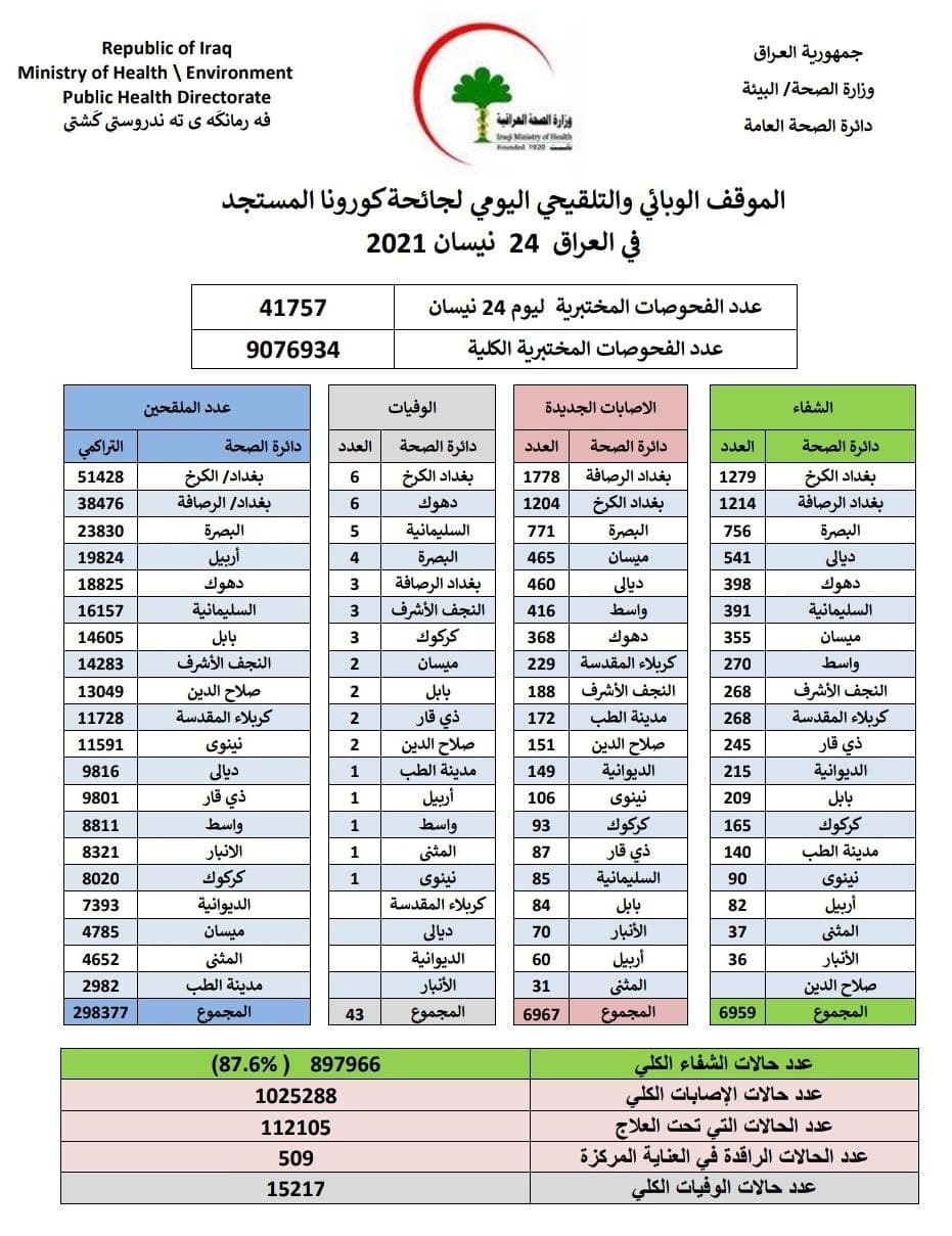 أعلنت وزارة الصحة، اليوم السبت، الموقف الوبائي الخاص بجائحة كورونا في عموم العراق.