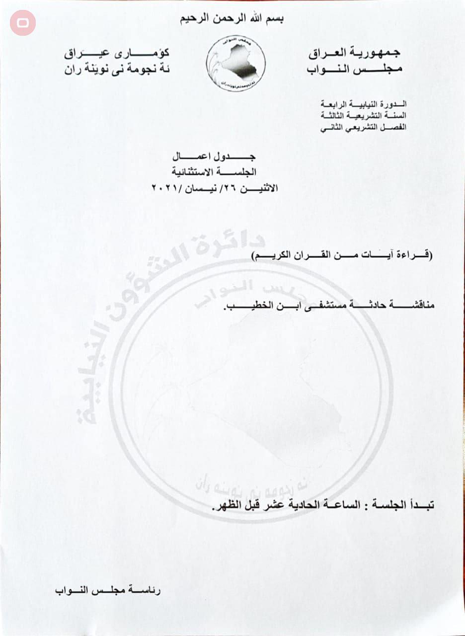 وبحسب جدول الاعمال الذي اصدره مجلس النواب ، فان "جلسة الغد ستتضمن مناقشة حادثة مستشفى ابن الخطيب فقط".