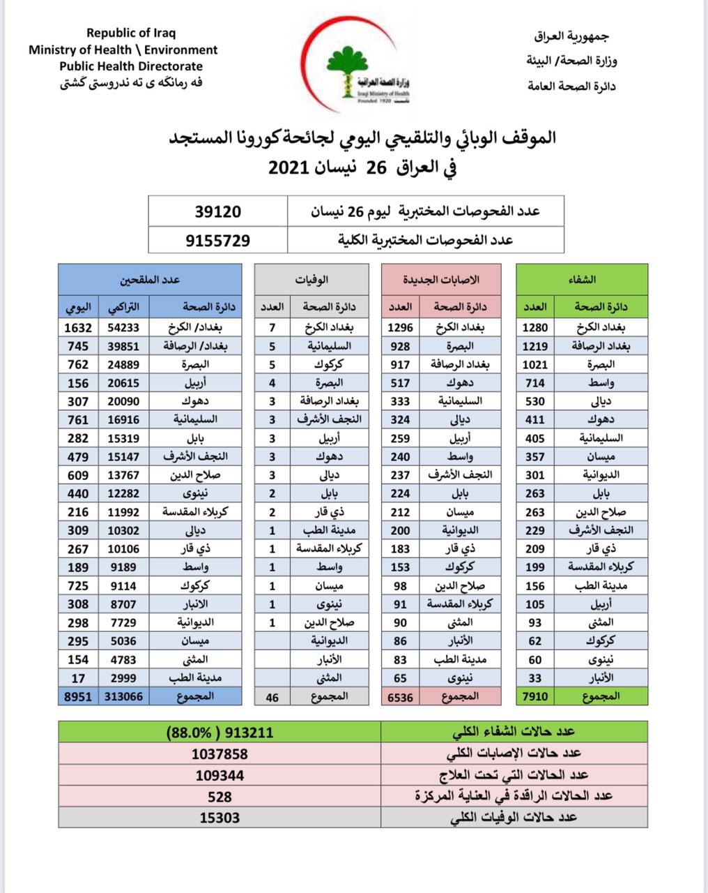 أعلنت وزارة الصحة، اليوم الاثنين، الموقف الوبائي الخاص بجائحة كورونا في عموم العراق.