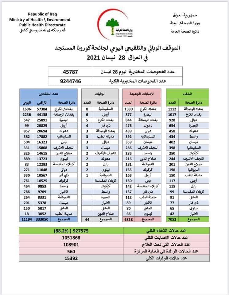 أعلنت وزارة الصحة والبيئة، اليوم الأربعاء، الموقف الوبائي والتلقيحي اليومي الخاص بجائحة كورونا في عموم العراق.