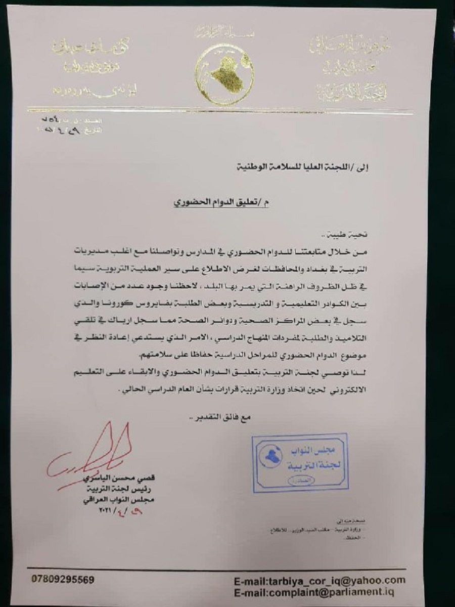 وبحسب الوثيقة فقد عللت اللجنة النيابية طلب تعليق الداوم "بظهور حالات اصابة بين الكوادر التعليمية والتدريسية وكذلك الطلاب"، حيث دعت الى "اعادة النظر في موضوع الداوم الحضوري حفاظا على سلامة الجميع".
