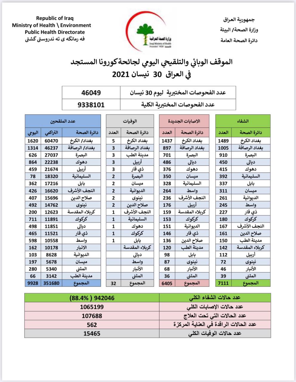 أعلنت وزارة الصحة والبيئة، اليوم الجمعة، الموقف الوبائي الخاص بجائحة كورونا في عموم العراق.