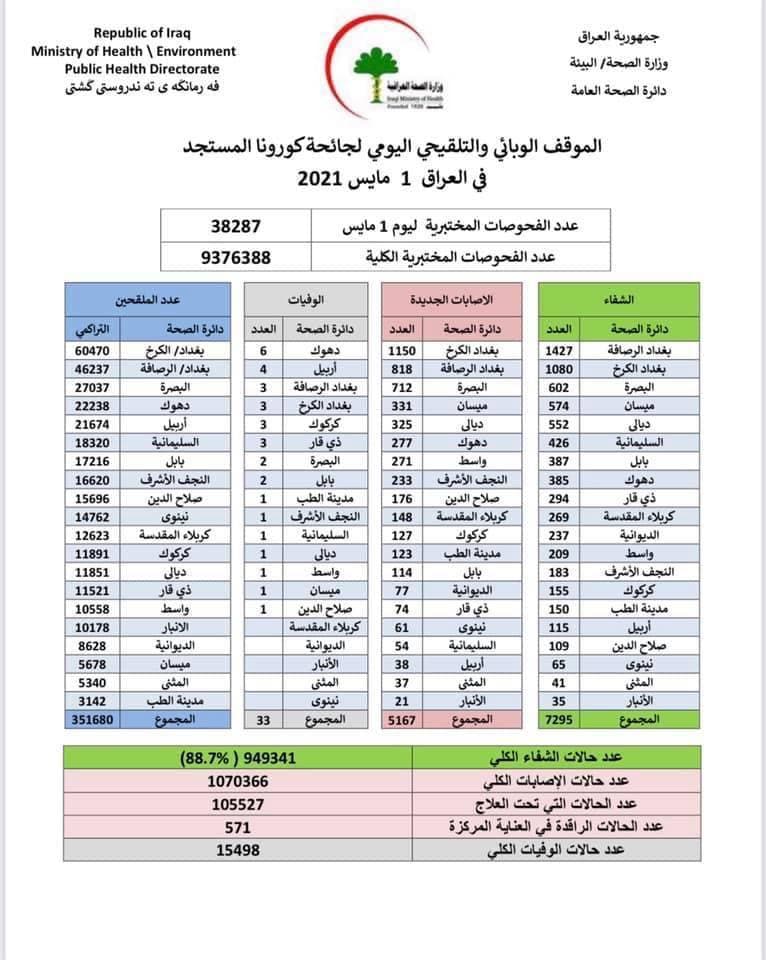 أعلنت وزارة الصحة، اليوم السبت، الموقف الوبائي الخاص بجائحة كورونا في عموم العراق.