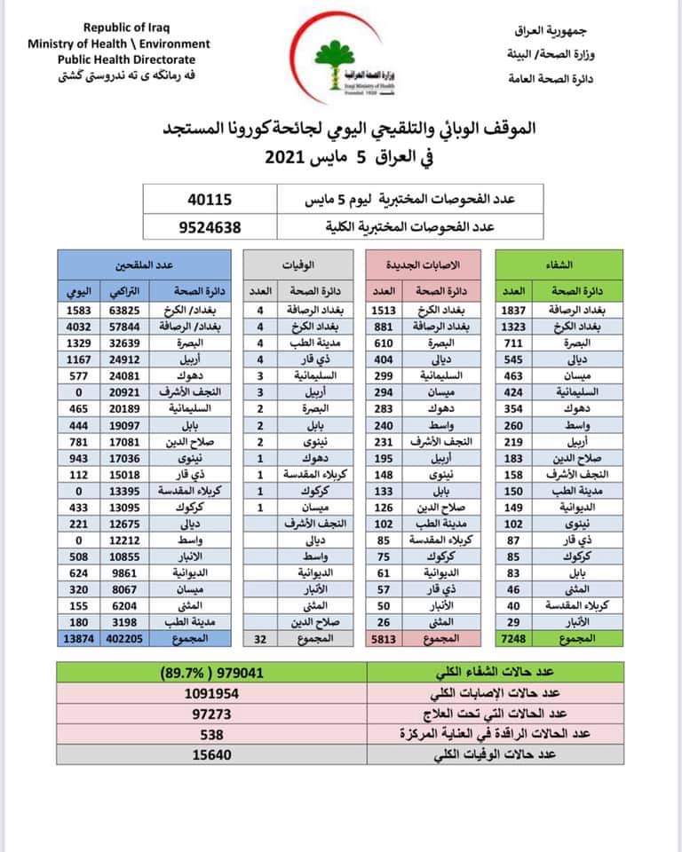 أعلنت وزارة الصحة، اليوم الأربعاء، الموقف الوبائي الخاص بجائحة كورونا في عموم العراق.