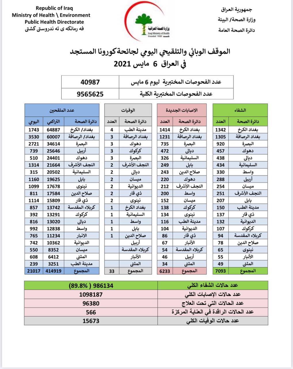 وقالت الوزارة في بيان إن "كوادرها سجلت 6233 حالة إصابة جديدة، مقابل تماثل 7093 حالة للشفاء، و33 حالة وفاة بالفيروس".