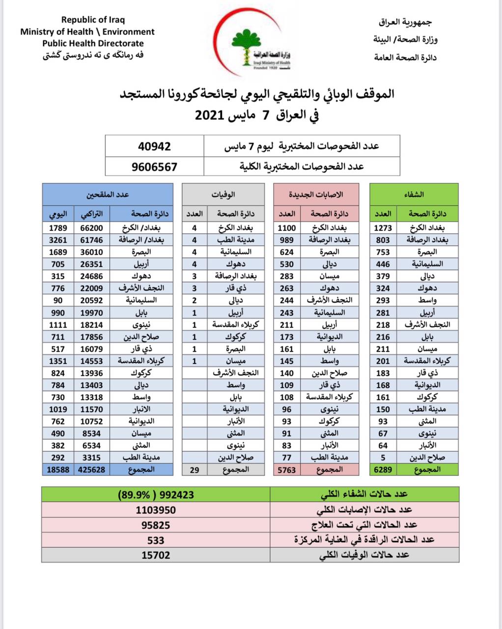 أعلنت وزارة الصحة والبيئة، اليوم الجمعة، الموقفين الوبائي والتلقيحي فيما يتعلق بجائحة فيروس كورونا، بالعراق.