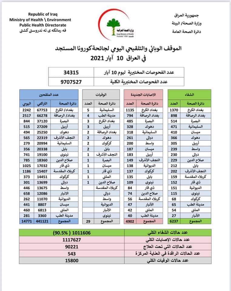 أعلنت وزارة الصحة والبيئة، اليوم الاثنين، الموقف الوبائي الخاص بجائحة كورونا في عموم العراق.