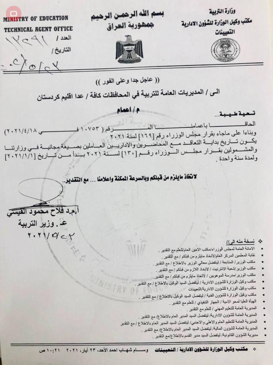 وذكرت الوزارة خلال وثيقة صادرة عنها،"يكون بداية التعاقد مع المحاضرين والإداريين العاملين بصيغة "مجانية" في وزارتنا والمشمولين بقرار مجلس الوزراء رقم (130) لسنة 2021 بدءاً من تأريخ 1 / 1 / 2021 ، ولمدة سنة واحدة".