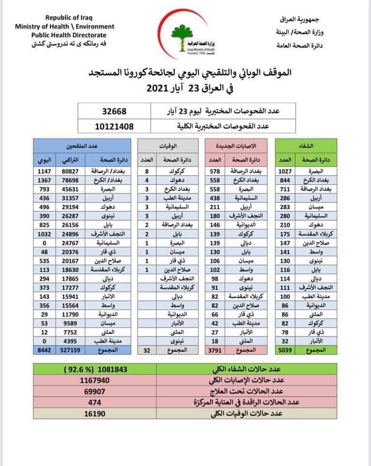 أعلنت وزارة الصحة، اليوم الأحد، الموقف الوبائي الخاص بجائحة كورونا في عموم العراق.