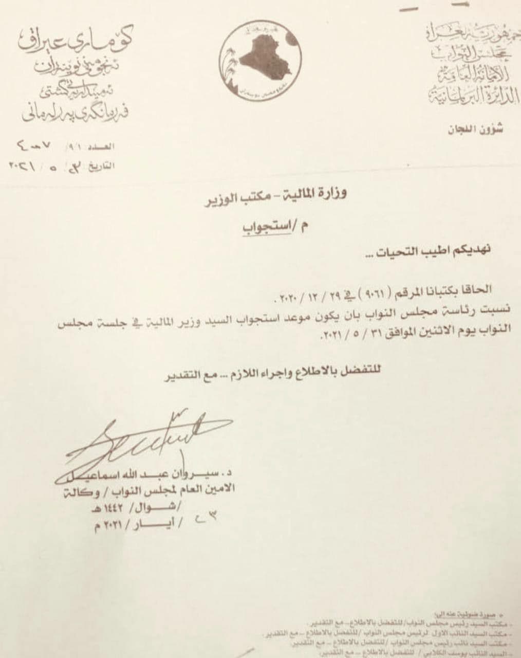 وبحسب وثيقة صادرة عن الأمين العام لمجلس النواب، سيروان عبد الله، وردت إلى فأنه "تقرر أن يكون يوم الاثنين المصادف 31 أيار، موعدا لاستجواب وزير المالية".