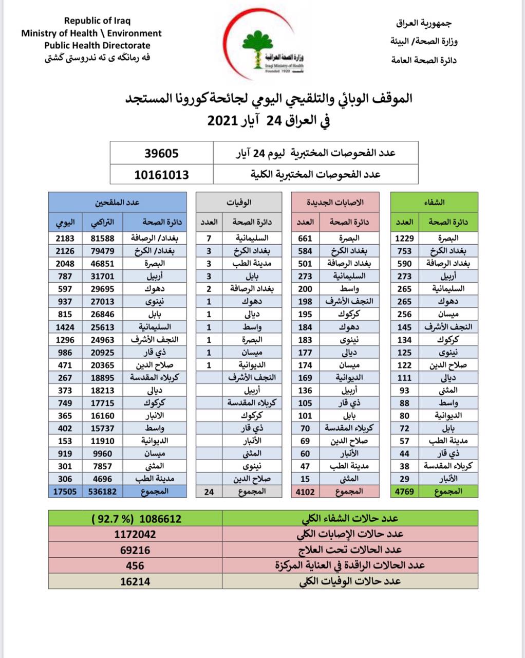 وقالت الوزارة في بيان، إنها "سجلت 4102 حالة إصابة جديدة، مقابل تماثل 4769 حالة للشفاء، و 24 حالة وفاة بفيروس كورونا".