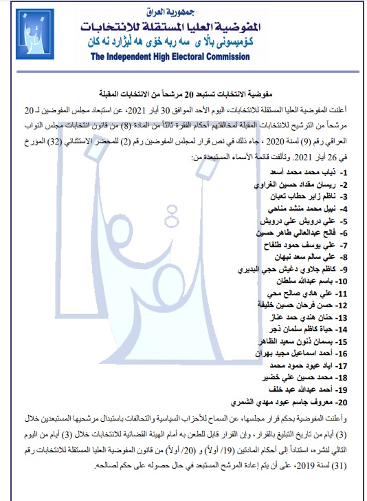 أعلنت المفوضية العليا المستقلة للانتخابات، اليوم الأحد، عن استبعاد مجلس المفوضين لـ 20 مرشحاً من الترشيح للانتخابات المقبلة لمخالفتهم أحكام الفقرة ثالثاً من المادة (8) من قانون الانتخابات.