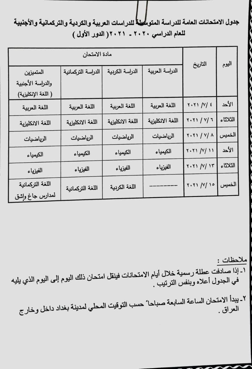 اعلنت وزارة التربية، اليوم الاربعاء، الجدول الخاص بالامتحانات الوزارية للدراسة المتوسطة وللعام الدراسي 2020 – 2021 "الدور الأول" .