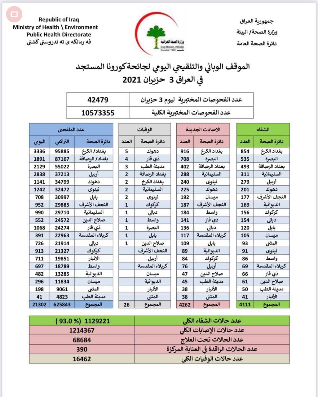 كما اكدت وزارة الصحة "تماثل 4111 حالة للشفاء في عموم البلاد، فيما بلغ مجموع الذين تلقوا اللقاح خلال يوم واحد 21302".