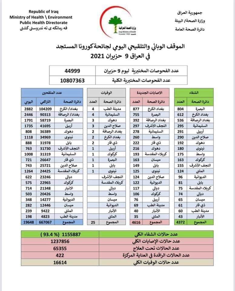 أعلنت وزارة الصحة والبيئة، اليوم الأربعاء، الموقف الوبائي الخاص بجائحة كورونا في عموم العراق.