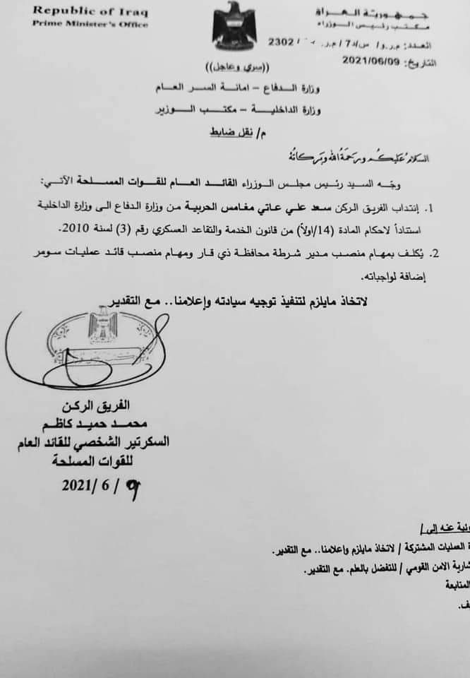 وبحسب الوثيقة انه "تم انتداب الفريق الركن سعد عاتي الحربية من وزارة الدفاع الى وزارة الداخلية استنادا لاحكام المادة (14/اولا) من قانون الخدمة والتقاعد العسكري رقم 3 لسنة 2010 وتكليفه بمنصب قائد شرطة ذي قار بالاضافة الى منصب قائد عمليات سومر".