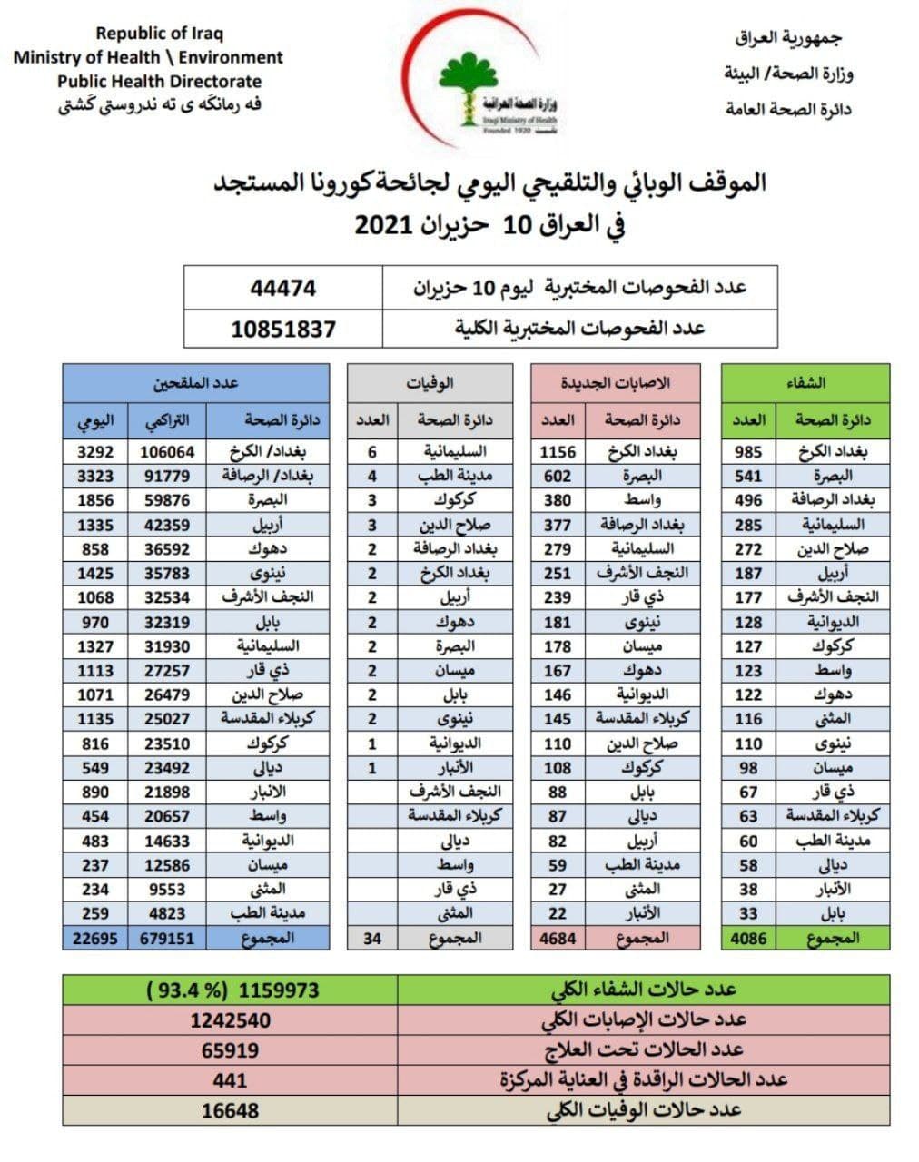 أعلنت وزارة الصحة والبيئة، اليوم الخميس، الموقف الوبائي اليومي لجائحة كورونا في العراق.