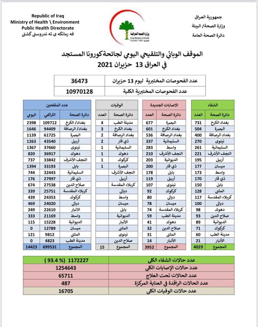 أعلنت وزارة الصحة والبيئة، اليوم الأحد، الموقف الوبائي الخاص بجائحة كورونا في عموم العراق.
