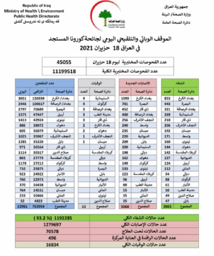 أعلنت وزارة الصحة، اليوم الجمعة، الموقف الوبائي والتلقيحي خلال الـ 24 ساعة الماضية في عموم البلاد.