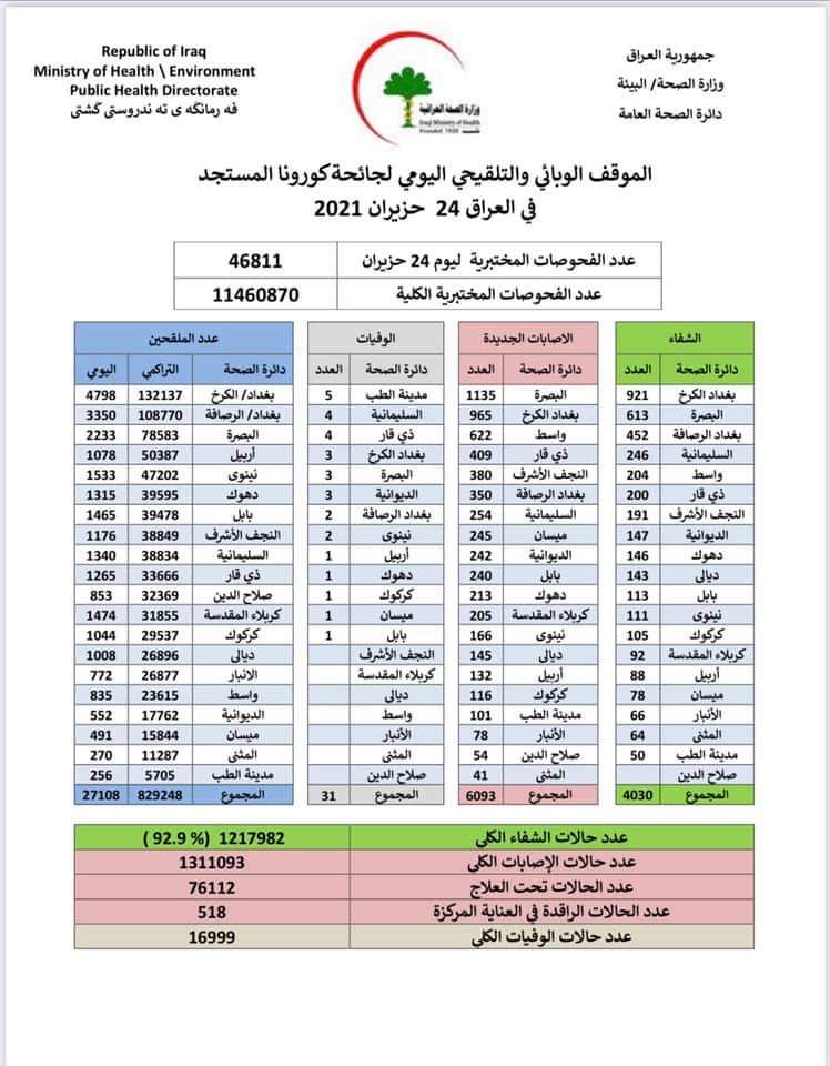أعلنت وزارة الصحة، اليوم الخميس، الموقف الوبائي الخاص بجائحة كورونا في العراق.