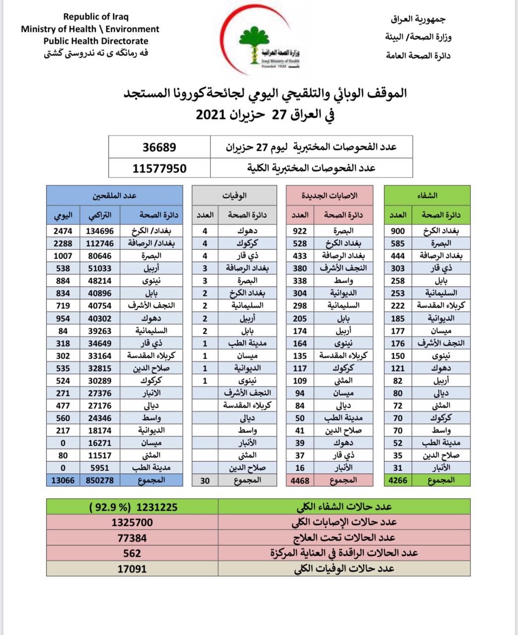 أعلنت وزارة الصحة والبيئة، اليوم الأحد، الموقف الوبائي الخاص بجائحة كورونا في عموم العراق.