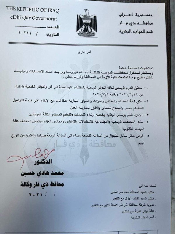 قررت محافظة ذي قار، تعطيل الدوام لمدة أسبوع بسبب تزايد إصابات كورونا.
