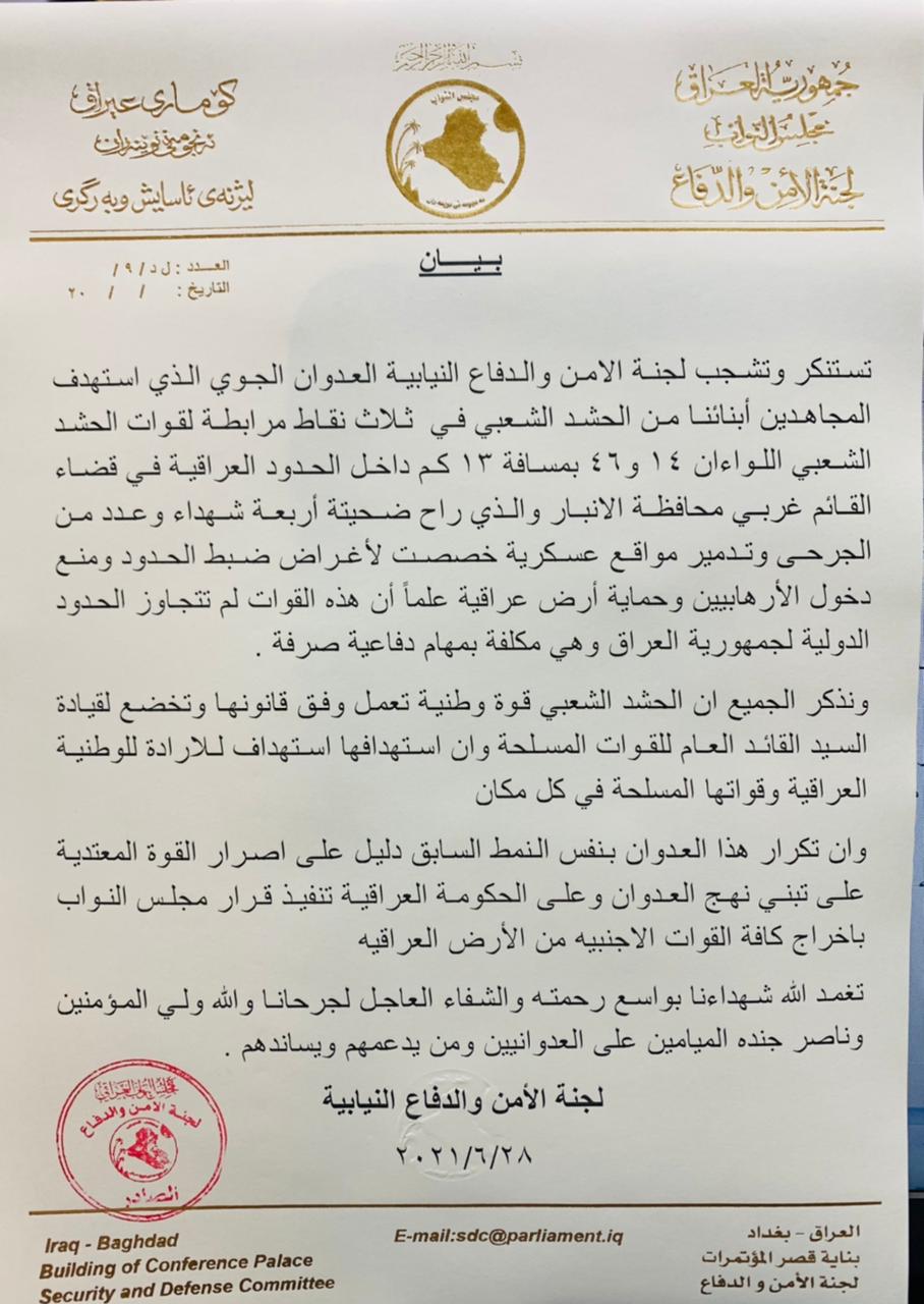 وقالت اللجنة في بيان، إنها "تدين وتشجب العدوان الجوي الذي طال المجاهدين في الحشد الشعبي في ثلاث نقاط مرابطة داخل الحدود العراقية، وأوقع 4 شهداء وجرحى وتدمير مواقع عسكرية خصصت لإغراض ضبط الحدود".