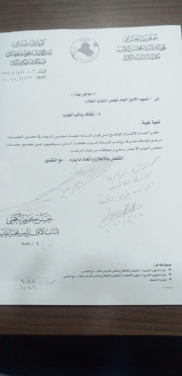 وقال الكعبي في وثيقة، إنه "نظراً لعدم الالتزام الواضح من اعضاء البرلمان في حضور الجلسات نرجو ايقاف صرف رواتب النواب كافة الذين سيتغيبون عن حضور جلسات البرلمان الا بعذر رسمي او موافقة هيئة الرئاسة".