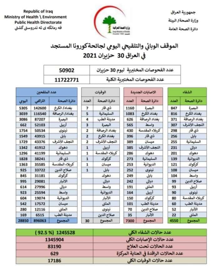 أعلنت وزارة الصحة، اليوم الأربعاء، الموقف الوبائي الخاص بجائحة كورونا في عموم العراق.