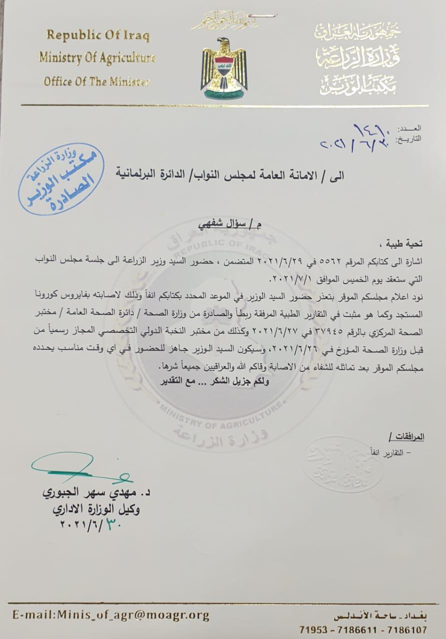 أعلنت وزارة الزراعة، الاربعاء، عن إصابة وزيرها محمد كريم الخفاجي بفايروس كورونا، مؤكدة عدم استطاعته الحضور لجلسة يوم غد.